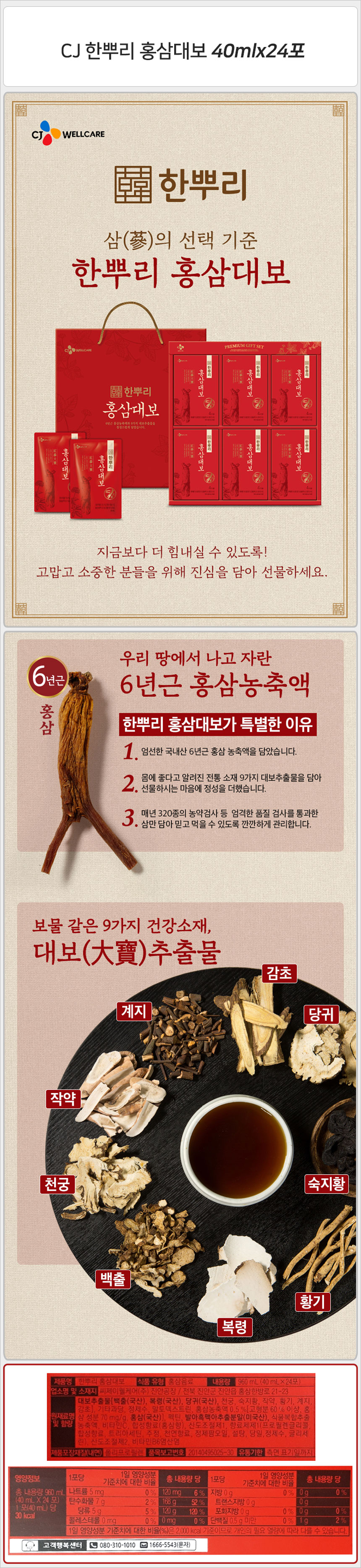 HOME > 건강기능식품 > CJ 한뿌리 홍삼대보 40mlx24포x4set